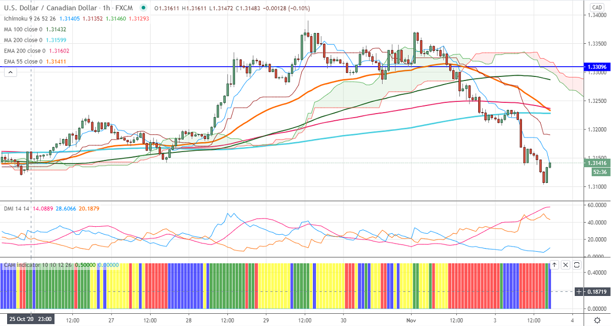 USDCAD is trading weak for the second consecutive days and lost more than 250 pips. The rise in investor sentiment and a surge in crude oil supporting the Canadian dollar. Markets eye US election results for further direction. It hits an intraday low of 1.31039 and currently trading around 1.3140.