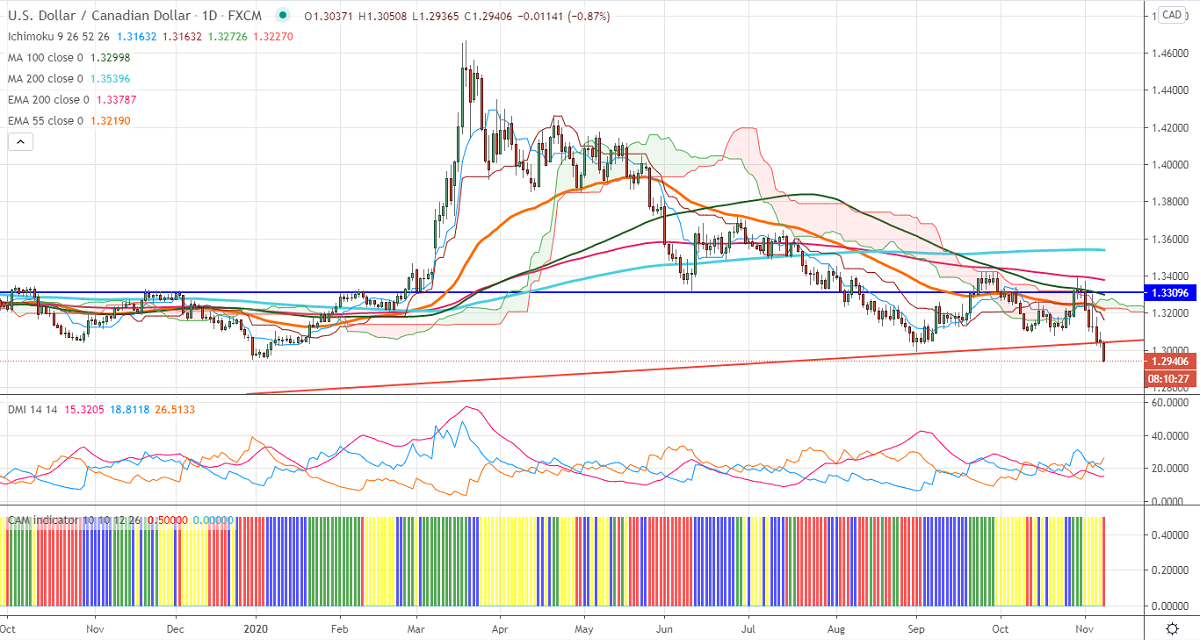 USDCAD continues to trade lower for the past ten days and lost more than six days on broad based US dollar selling. The demand for global riskier assets has increased sharply due to the blue wave in United States DXY has shown a minor recovery after hitting a low of 92.18. The overall trend is still weak as long as resistance 93 holds. Loonie hits an intraday low of 1.29551 and currently trading around 1.29551.
