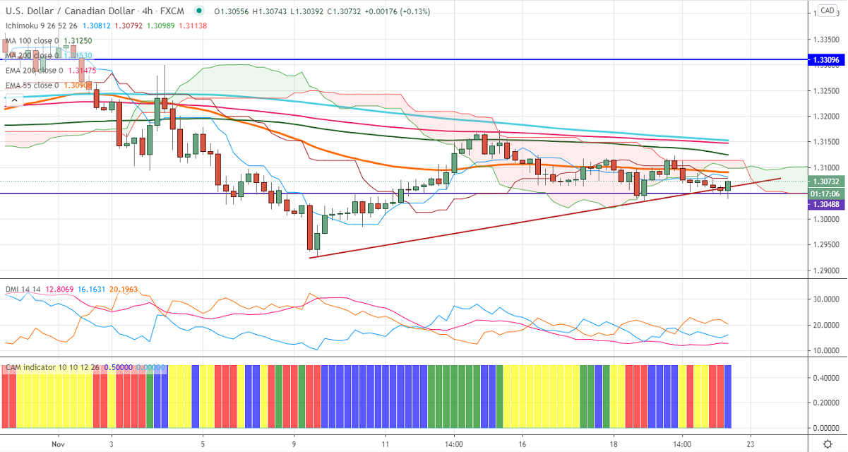 USDCAD has shown a minor recovery despite better than expected Canadian retail sales data. It grew by 1.1% in September compared to a forecast of 0.2%. The surge in the new number of coronavirus is supporting the US dollar at lower levels.DXY is facing strong resistance at 200-H MA at 92.65, any hourly close above targets 93/93.20. Loonie hits an intraday high of 1.30718 and currently trading around 1.30600.