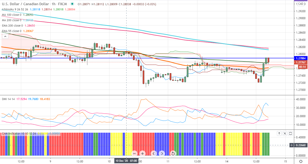 USDCAD has shown a minor jump after a significant sell-off of more than 450 pips in past one month. The slight recovery was mainly due to short covering and increasing COVID-1 9 cases. Germany Chancellor Merkel announced tight measures to curb Coronavirus spread. She has asked stores, schools, and daycare centers to be closed until Christmas. The slight increase in demand for safe-haven assets is supporting the US dollar at lower levels. DXY surged more than 30pips from a low of 90.42. Loonie hits an intraday low of 1.27873 and currently trading around 1.27804.