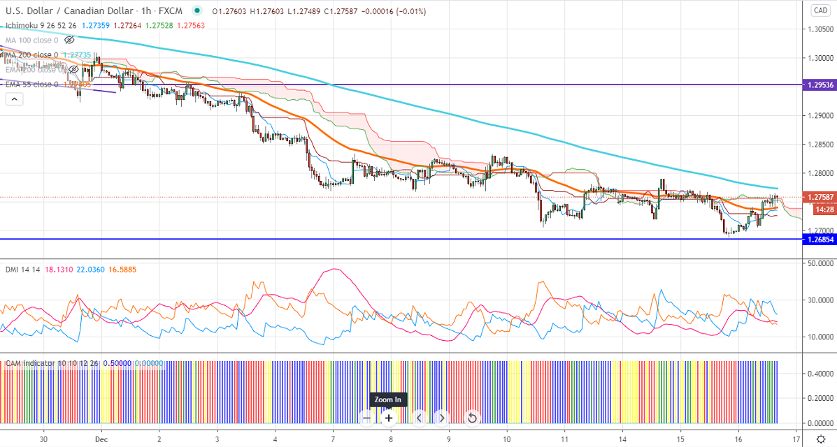 USDCAD recovered slightly after a major sell-off. The pair was one of the best performers in the past 9 months and lost more than 13% on broad based US dollar selling and COVID-19 vaccine optimism. The US retails sales declined for the second consecutive months and dropped by -1.1% in November compared to a forecast of -0.3%. US flash manufacturing PMI came DXY surged more than 30pips from a low of 90.42. Loonie hits an intraday low of 1.27873 and currently trading around 1.27804.