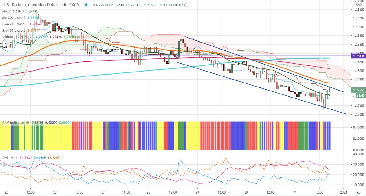 USDCAD has shown a minor recovery after hitting a 2-week low. Loonie was one of the best performers in the past 9 months on broad based US dollar selling and strong Crude oil price. The number of people who have filed for jobless benefits declines for a consecutive week. It came at 787K for the week ended Dec 26th compared to the forecast of 832K. USDCAD hits an intraday low of 1.27614 and currently trading around 1.27604.