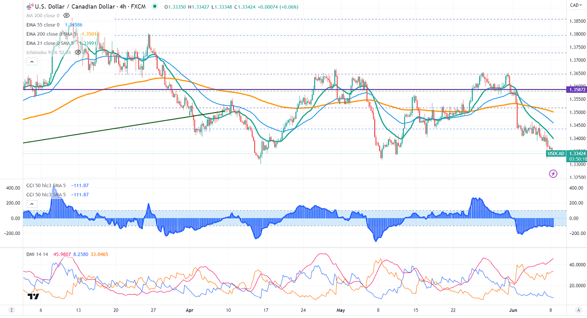 Technically in the 4-hour chart, the pair is holding below short-term (21- and 55 EMA) and 200 EMA (1.36301). Any break below 1.3300 will take the pair to 1.3220/1.3200.
