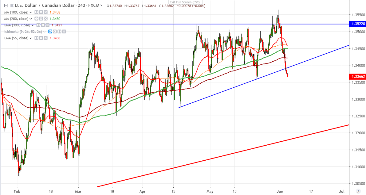USDCAD trades lower for 4th consecutive day and decline more than 150 pips on broad based US dollar selling. The declining bond yield and yield curve inversion is putting pressure on USD. Fed Chairman Powell clearly said yesterday that central bank “will act appropriate” if US economy poses any risk on account of trade war This increased hopes of further rate cut. The pair hits low of 1.33691 amid weak crude oil price. It is currently trading around 1.33716.