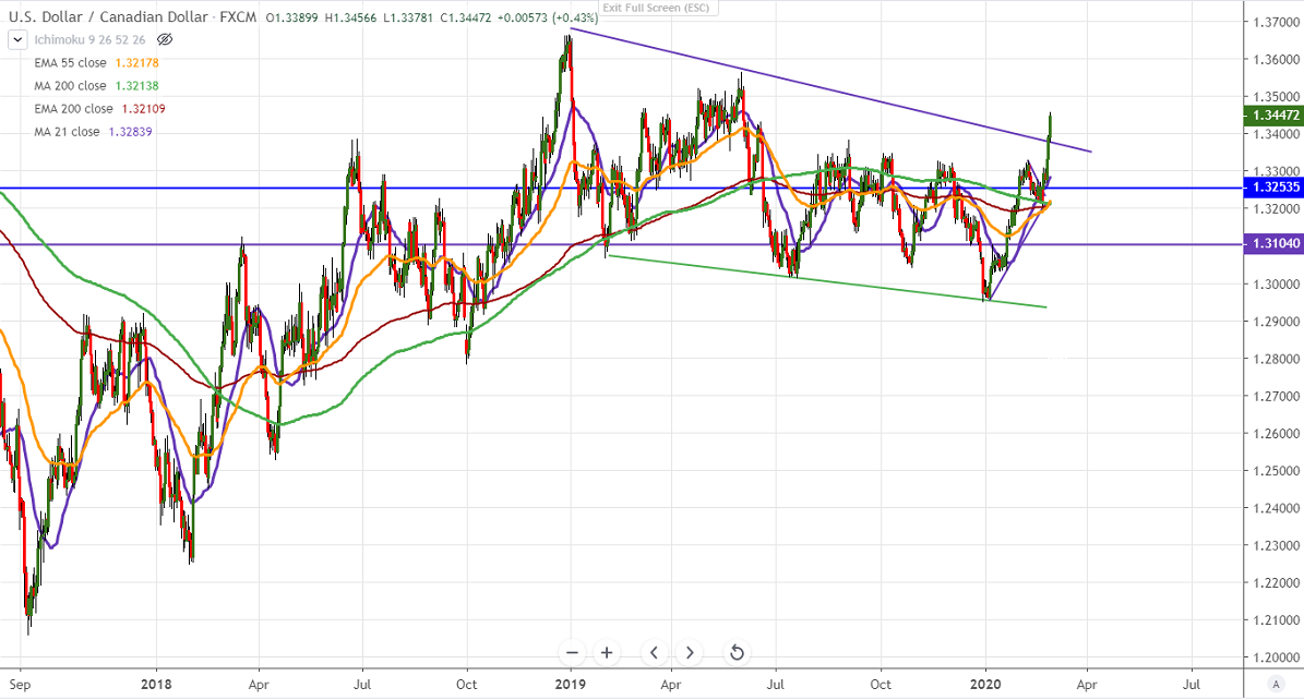 As per analysis USDCAD surged sharply and hits 8-month high on weak crude oil prices. WTI crude oil hits fresh 52-week low at $45.06 as the spread of coronavirus will reduce Chinese import by 20% next month. The pair jumped till 1.3 and is currently trading around 1.33245.