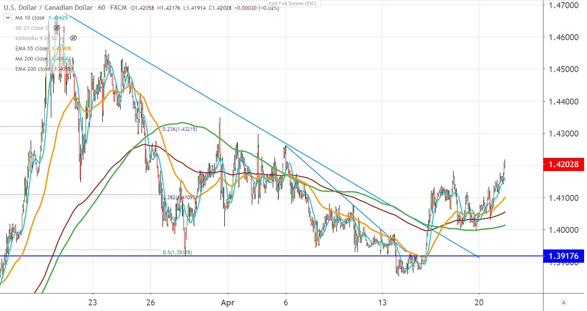 USDCAD has recovered sharply more than 150 pips from an intraday low of 1.40315. The massive sell-off in WTI crude oil prices yesterday and fallen below $0 level first time in history. Ahead of expiry on Tuesday, NYMEX futures declined to minus $37.63 a barrel.