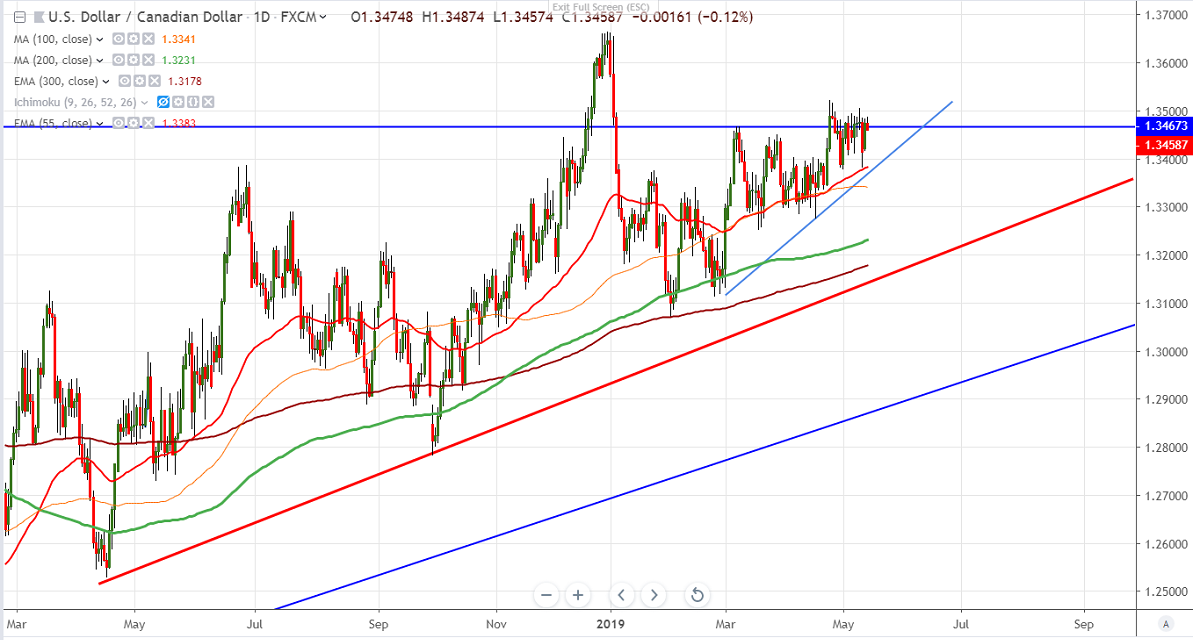 USDCAD has shown nearly 100 pips jump from low of 1.3380 made on May 10th 2019. The pair jumped till 1.34874 and is currently trading around 1.34655. Crude oil is trading lower for past 20 days and lost more than $6 from high of $66.58.