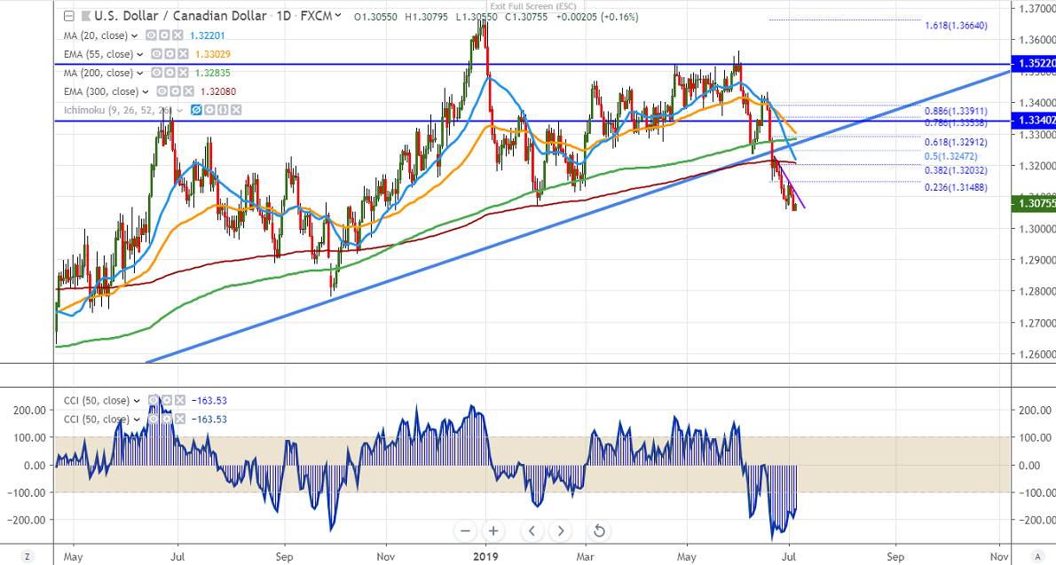 USDCAD continues to trade lower after a minor jump till 1.31453 yesterday. The better than expected Canadian trade balance is one the reason for weakness in the pair. Canada's trade balance was at the C$762M surplus compared to the forecast of the C$1.70M deficit. But the US trade deficit has swollen from $51.2B to $55.5 worst than the forecast of $53.2B. The pair has broken low at1.30595 made on Jun 28th, 2019. It is currently trading around 1.30734.