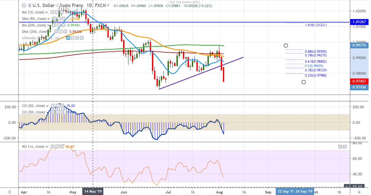 USDCHF lost nearly 100pips for the day on renewed US-China trade war. China has responded to US tariff threat by devaluing Yuan and suspended imports of US agricultural products.US dollar index is trading lower for 3rd consecutive days and lost more than 100pips from 27 months high 98.93. The US 10-year bond yield hits 3-year low and declined more than 6% for the day.