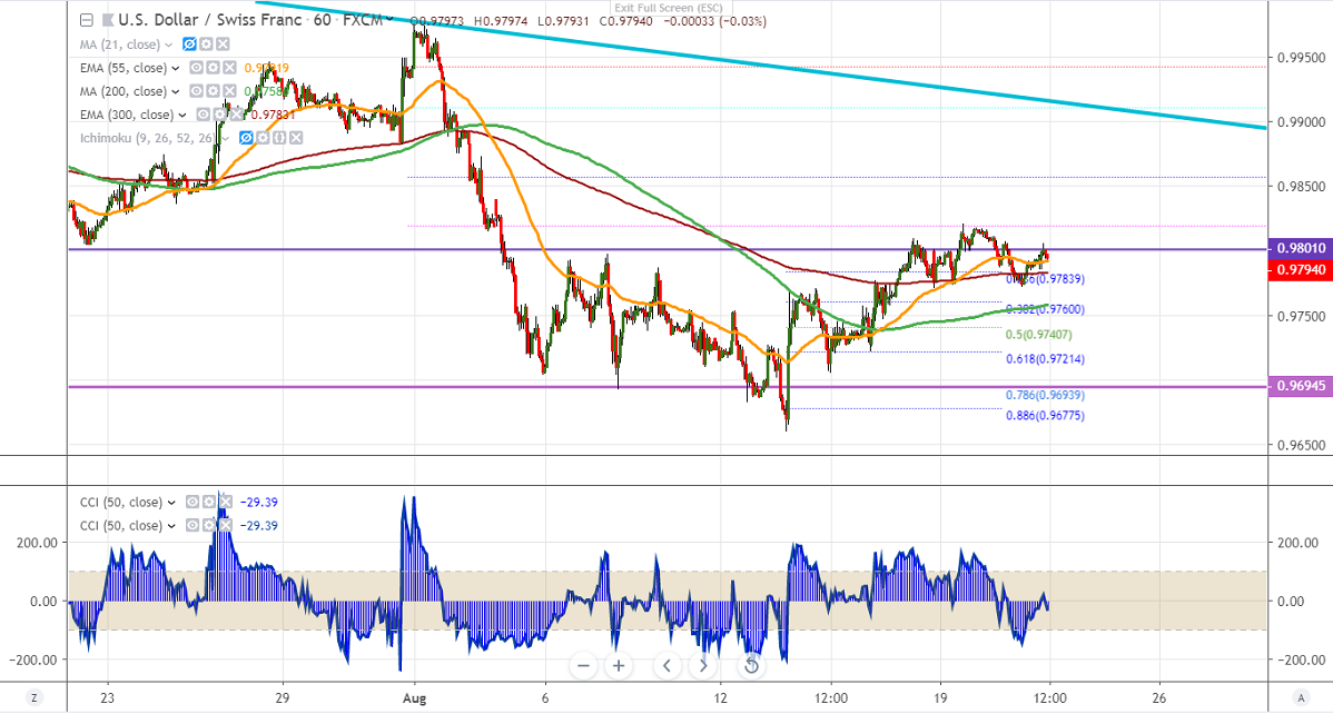 USDCHF is in a range bound between 0.97750 and 0.98210 for the past three trading days. The overall trend is on the upside on global stock market recovery due to hopes of fresh stimulus from major economies like China and Germany. Markets eye US FOMC minutes and Jackson Hole symposium for further direction. The slight easing in trade tension has reduced demand for Safe-haven assets like yen and Swiss franc. It is currently trading around 0.97938.