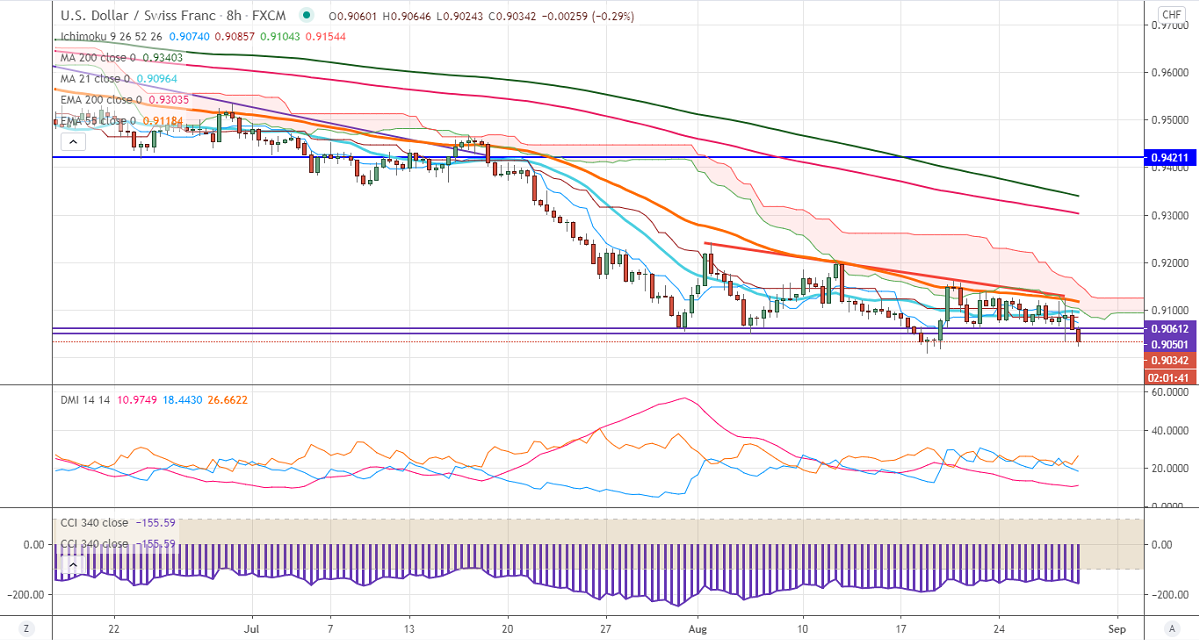 The pair is still in a downtrend, any break above 0.9197 (Aug 12th high) confirms bullish continuation. The minor near term resistance to be watched is 0.9050/0.9100/0.9135. The near-term support is around 0.9000, any break below targets 0.8940/0.8900. The decline from 0.9900 will get completed at 0.9050 only if it breaks 0.9250.