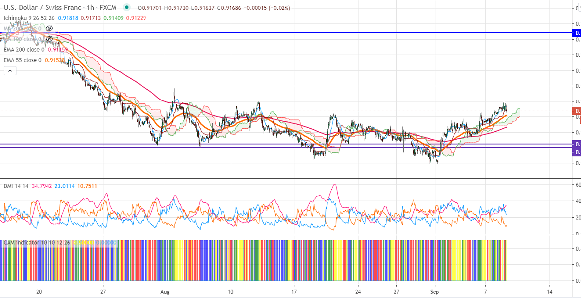 USDCHF continues to trade higher and holding well above 200-EMA. The broad-based US dollar buying and renewed US-Sino trade tension is supporting the US dollar. The United States 10-year bond yield declined more than 8% after forming a minor top around 0.723%. The pair hits an intraday high of 0.91999 and is currently trading around 0.91673.