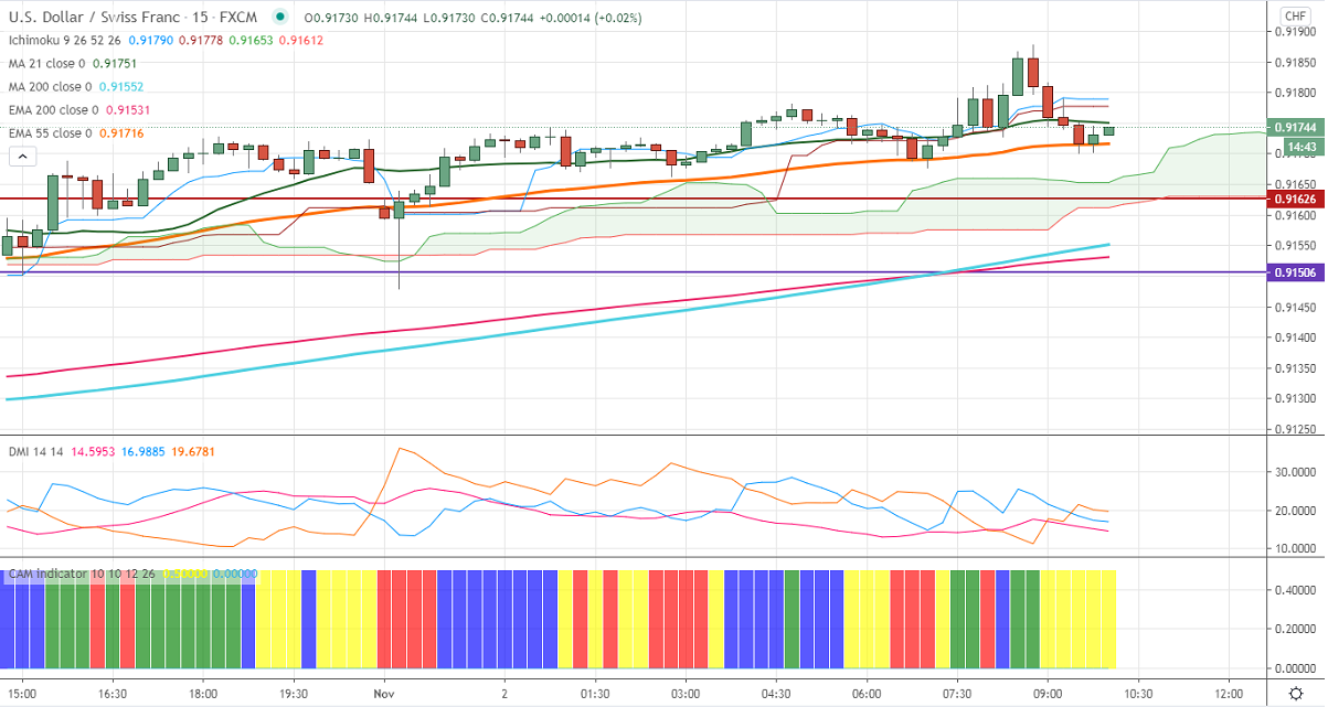 USDCHF continues to trade higher and holding well above significant resistance 0.9165 on a strong US dollar. Markets expected to trade volatile till the US elections get over. The pair hits a three -week high due to board- based US dollar buying. The better than expected US economic data and rising coronavirus cases are supporting the dollar index at lower levels. DXY is holding well above 94 levels, any violation above 94.20 confirms bullish continuation. A jump till 94.60/95 likely. USD CHF hits an intraday high of 0.91716 and is currently trading around 0.911664.