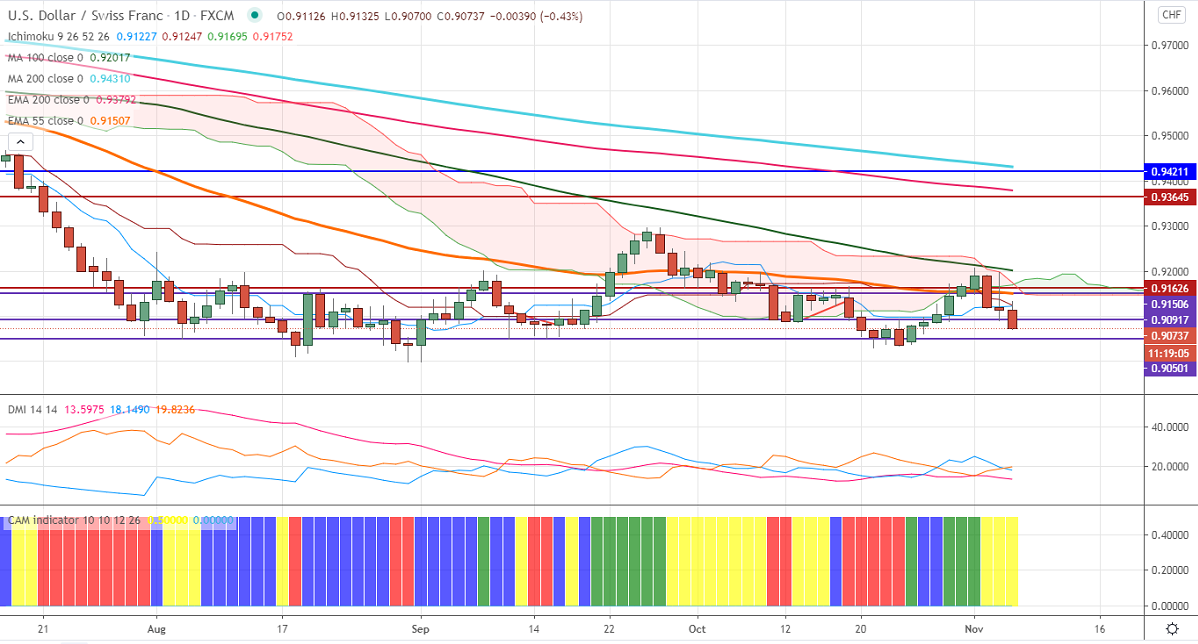 USDCHF continues to trade lower for the third consecutive days and lost more than 100 pips on broad-based US dollar selling. Joe Biden is leading against Donald Trump in the electoral college -253-214. Markets predict Biden to be elected as new President of the United States. The Fed monetary policy and jobless claims are significant data to be watched for further direction. DXY has declined more than 100 pips from a minor top 94.30. It is holding slightly below 93 levels, a dip till 92.65/92.50 likely. USD CHF hits an intraday high of 0.90700 and is currently trading around 0.90742.