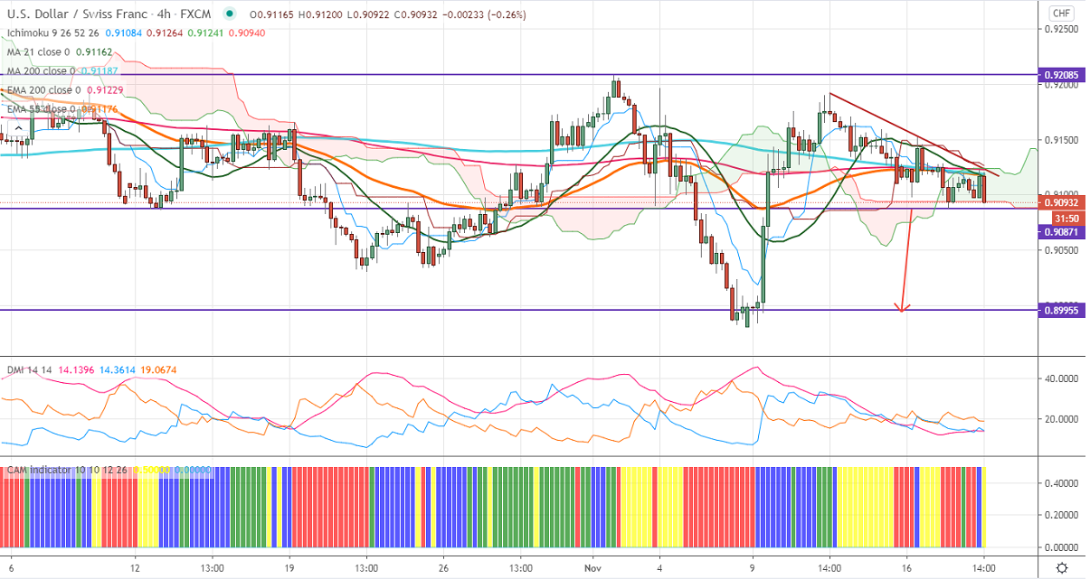 USDCHF is trading weak for the day and lost more than 100 pips from a high of 0.91920. The upbeat global sentiment on COVID-19 vaccine optimism is putting pressure on safe-haven assets like Gold.US dollar index continues to trade weak, significant weakness below 92. US bond yield jumped nearly 5% after a 15% fall till 0.836%. USD CHF hits an intraday low of 0.90922 and is currently trading around 0.90949.
