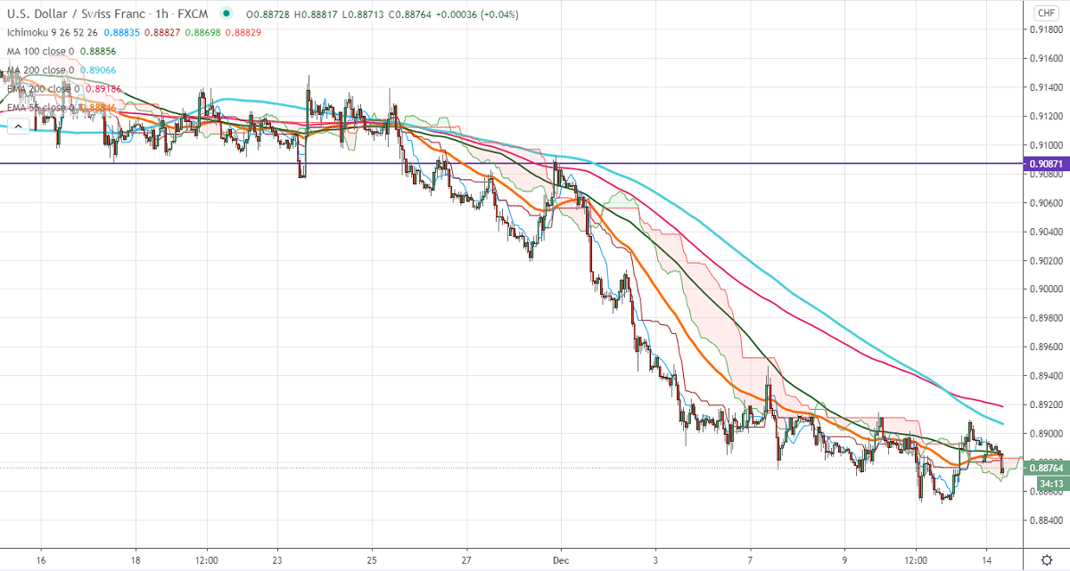 USDCHF is trading extremely weak after a minor recovery till 0.89082 on broad-based US dollar selling. US FDA has cleared Pfizer - BioNtech COVID-19 vaccine on Friday. The demand for Safe-haven assets like the dollar has decreased on COVID-19 vaccine optimism. It was one of the worst performers in the past 7 months and lost more than 1350 pips from a high of 1.02369. The slight delay in Coronavirus stimulus is supporting the US dollar at lower levels.