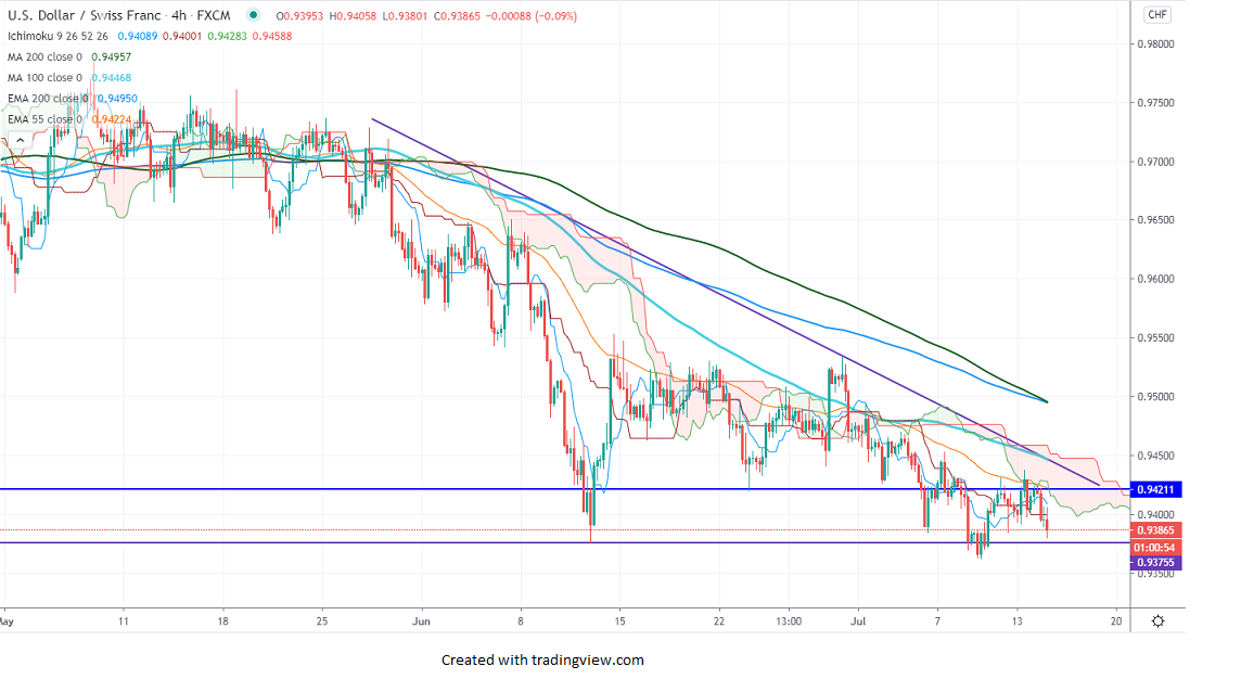 USDCHF is in the consolidation phase and intraday trend remains neutral as long as support 0.9360 holds. US CPI came at 0.6% mom in June better than an estimate of 0.5%, while Core Inflation rose 0.2% vs forecast of 0.1%. The decline in demand for Safe-haven due to Corona vaccine optimism is putting pressure on the U.S dollar. It is currently trading around 0.93860.