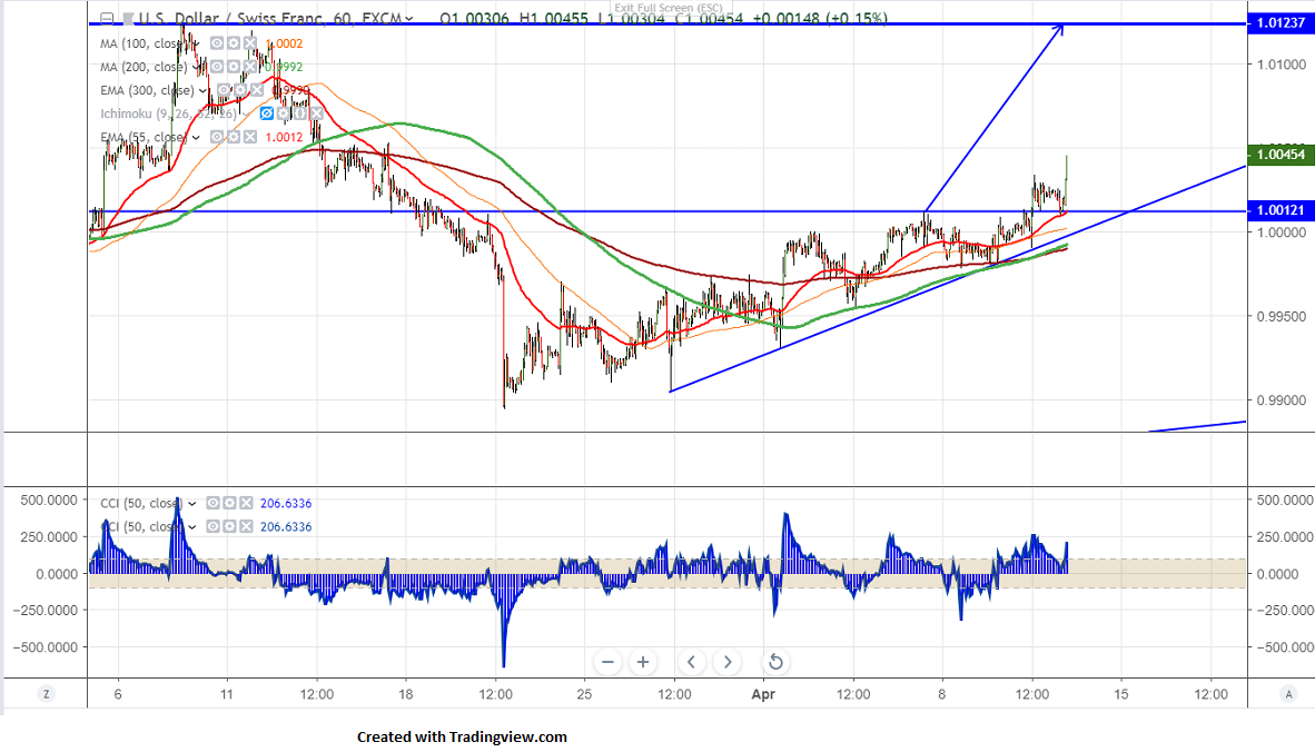 USDCHF has broken 1.0020 after long consolidation between 1.00122 and 0.99779 for past 1-week.USD is trading slightly weak against all majors expect Swiss franc after dovish Fed minutes meeting. EU leaders agreed to extend article 50 till Oct 31st 2019 and some of EU leaders already open for further extension beyond Oct 31 st.US 10 bond yield is trading higher after release of US PPI data.It came at 0.6% m/m compared to forecast of 0.3% and core PPI at 0.3% vs estimate of 0.2%. The pair hits intraday high of 1.00444 and is currently trading around 1.00433.
