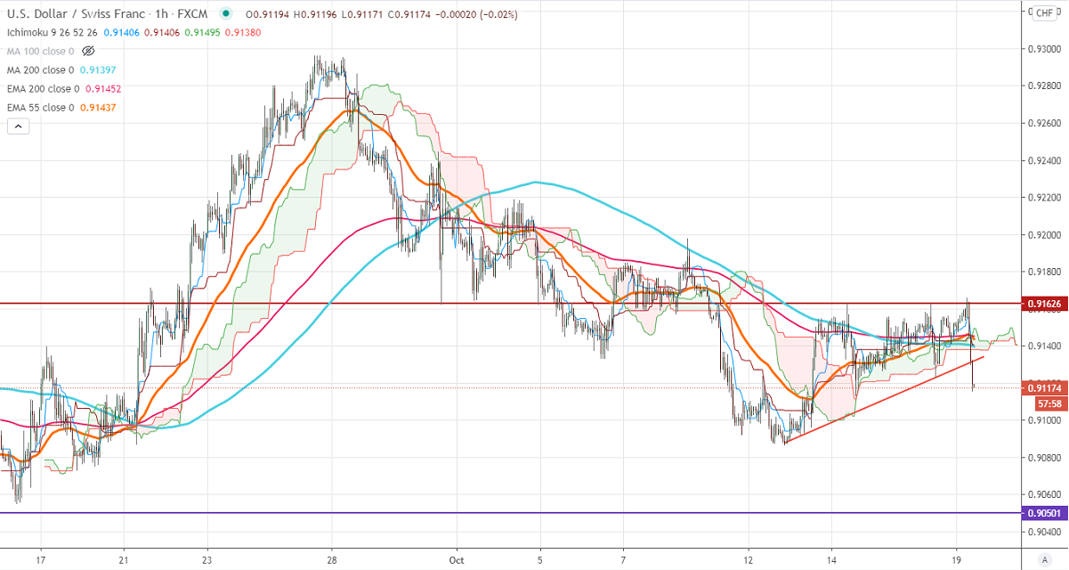 It is good to sell on rallies around 0.9128-30 with SL around 0.91650 for the TP of 0.9050.