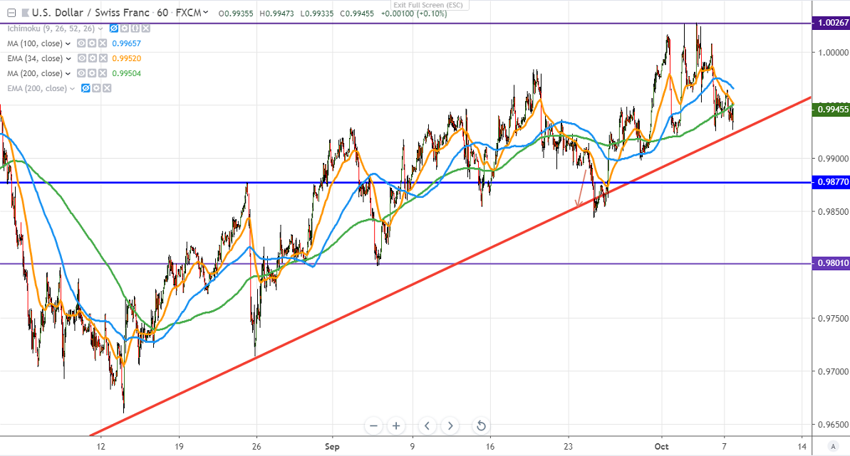 USDCHF has shown a decline yesterday after a minor jump till the 1.00266 level. The decline was mainly due to weak US economic data which has increased the hopes of rate cut by the Fed. Markets eye another round of trade talks between US-China which is to happen on Thursday and Friday in Washington. DXY lost more than 100 pips after hitting a 28-month high at 99.67. US 10- year recovered slightly more than 3% from intraday low of 1.513%.
