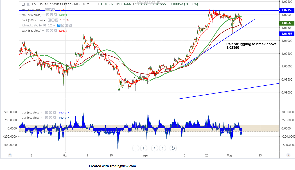 USDCHF has has once again declined after showing a jump above 1.02000 on Friday. US economy has added 263000 jobs in Apr compared to forecast of 181K and unemployment declined sharply from 3.8% to 3.6%. USD Index jumped till 98.10 but started to decline on slight weakness in average hourly earnings which came at 0.2% compared to estimate of 0.3%. It hits high of 1.02144 and is currently trading around 1.01618.