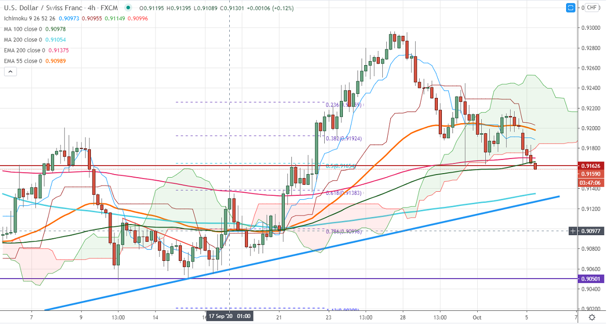 USDCHF is trading well below 55 4H EMA on a slight weakness in the US dollar. The positive update on Donald Trump's health has improved global market sentiment and US dollar index lost more than 20 pips for the day. Any violation below 93.50 confirms a bearish continuation, a dip till 93.28/93 is possible. The slight weak US nonfarm payroll data is also putting pressure on the US dollar index. The US economy has added 661000 jobs compared to an estimate of 900K. The unemployment rate declined to 7.9% from 8.2%. The pair hits an intraday low of 0.91602 and is currently trading around 0.91626.