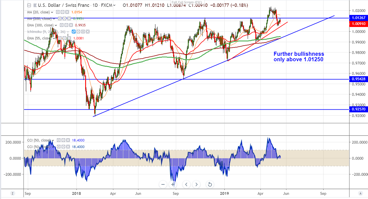 The pair has halted its 5 days of winning streak and shown a minor 30 pips decline. The jump was mainly due to broad based US dollar buying and slight easing geo political tensions. It has formed temporary top around 1.02369 and declined sharply on ongoing trade war tensions between US and China. US President Trump blacklist China’s telecom major Huawei and google suspends some business with Huawei. USDCHF hits high of 1.01216 yesterday and is currently trading around 1.00926.