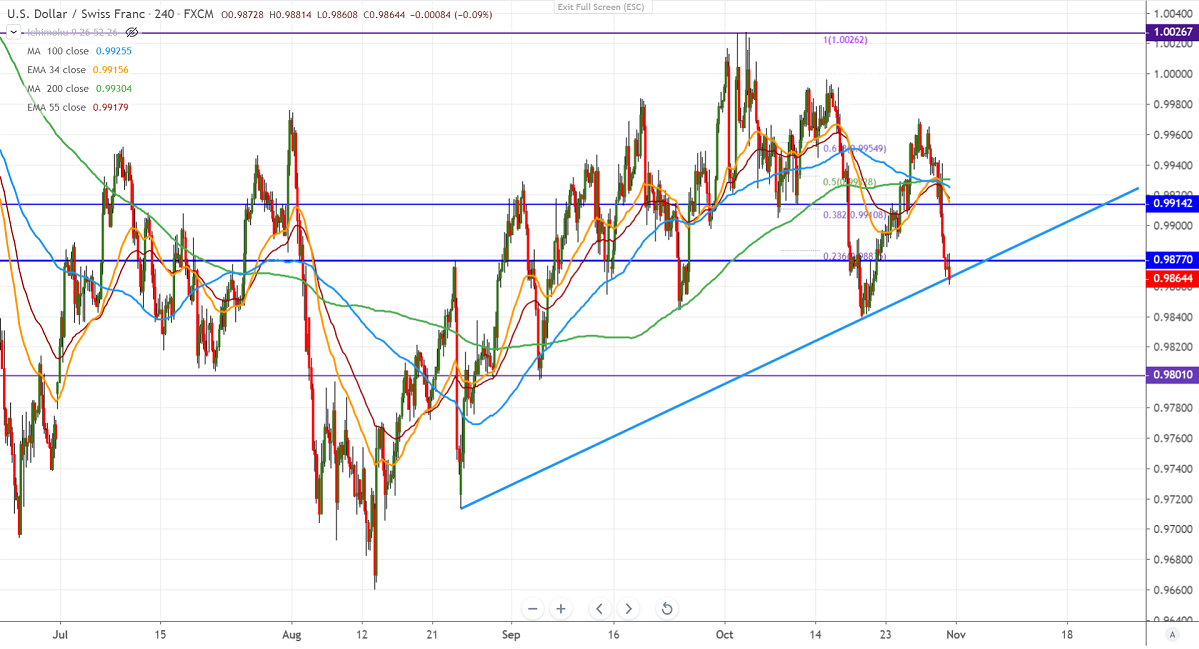 USDCHF trading weak for the past 4 trading days and lost more than 100 pips on broad-based US dollar selling. US Fed has cuts interest rates by 25 bps and hinted for a pause. Markets eye US PCE index and Chicago PMI data which is to be released today for further direction. The slight easing of the US-China trade war has increased demand for riskier assets like stocks. But still, uncertainty persists in Brexit which is expected to support Swiss franc at lower levels.