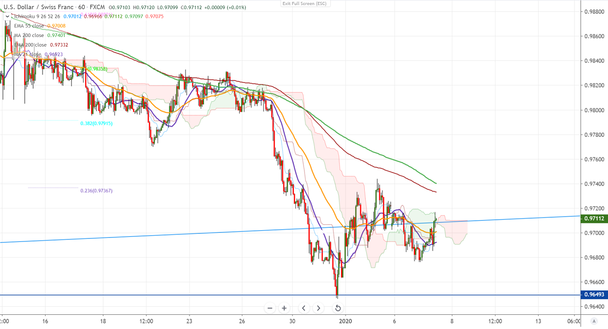 USDCHF is trading in a narrow range between 0.9645 and 0.9745 for the past 4 trading days. The pair has lost more than 350 pips in the 2 months on broad-based US dollar selling and a slight increase in demand for Safe-haven assets like yen, Swiss franc. It hits an intraday high of 0.97167 and is currently trading around 0.97120.