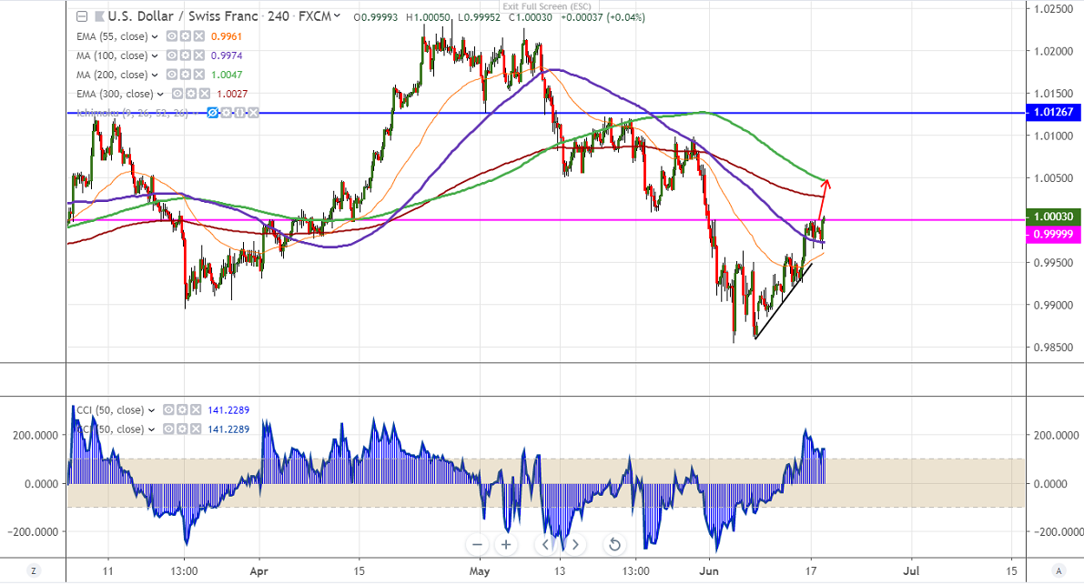 As per our analysis USDCHF has broken parity level in the European session on broad based US dollar buying. US dollar index shown a good jump of more than 30 pips from today's low after ECB President Draghi dovish speech. Markets eye Fed monetary policy on Wednesday for further direction.According CME Fed watch tool there is 20.8% probability of 25bpbs rate cut and 79.8% chance that the central bank will hold its rates unchanged. The pair hits high 1.00050 and is currently trading around 1.00037.
