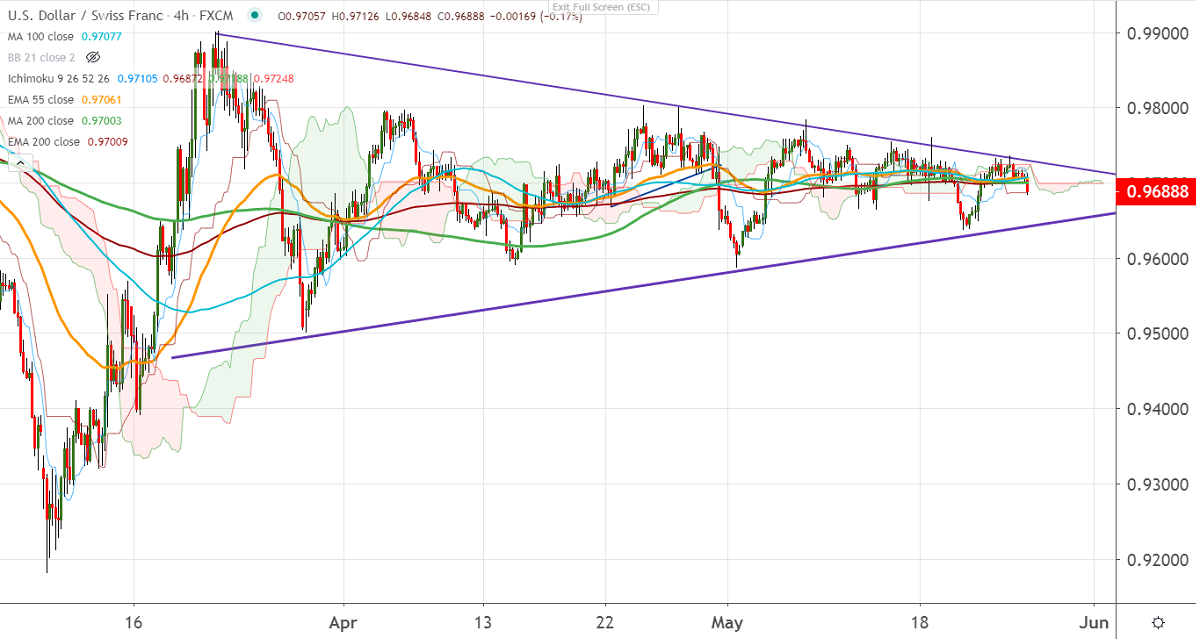 The near term minor resistance is at 0.9740 (trend line resistance), any break above targets 0.9760/0.9785. Minor bearish reversal can happen only above 0.98027 (Apr 24th, 2020 high) and surge past that level will reach 0.9900.