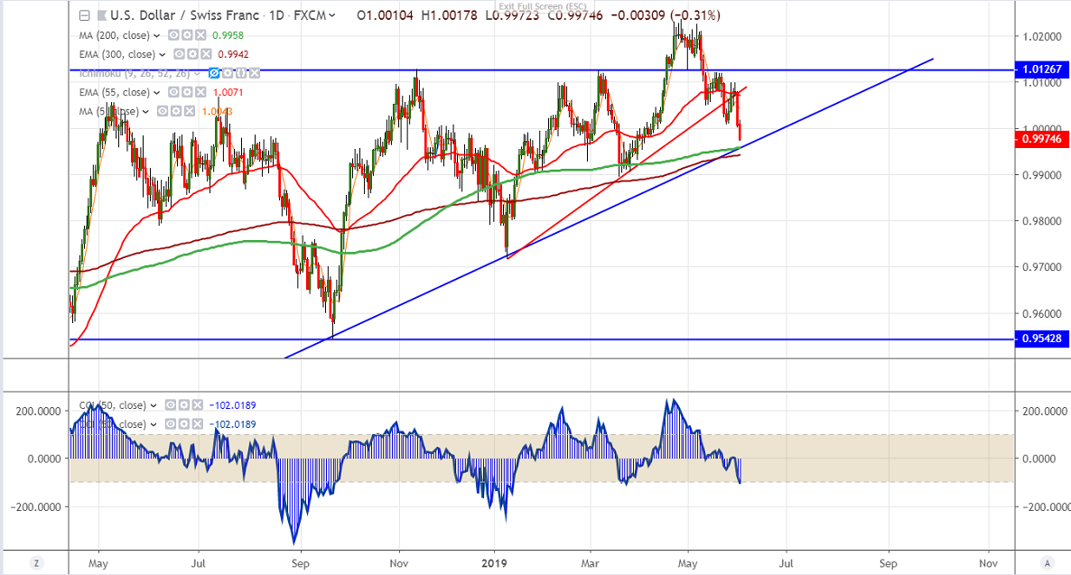 USDCHF is trading lower and lost more than 100 pips from high of 1.00865. The decline was mainly due to ongoing trade war. US will be imposing tariff to Mexico imports due to illegal immigrants to US. US 10 year bond yield declining sharply and hits lowest level since Sep 2017. The yield curve has inverted and spread has widened more than 20 basis point. The pair hits intraday low of 0.99723 and is currently trading around 0.99700.