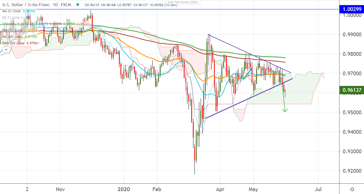 The near term minor resistance is at 0.9620, any break above targets 0.9660/0.9700/0.9720. Minor bearish reversal can happen only above 0.98027 (Apr 24th, 2020 high) and surge past that level will reach 0.9900.