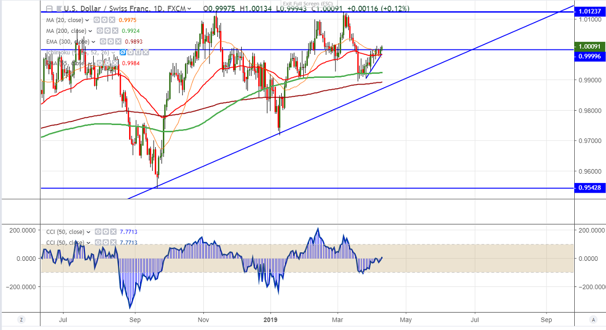 USDCHF is trading in narrow range between 1.00122 and 0.99779 for past 1-week.With no major release in past 2 days markets waiting for ECB policy ,Fed meeting minutes and EU Brexit summit for further direction.US dollar is trading lower against all majors on broad based dollar selling. IMF has downgraded global growth outlook and EU and US trade tension also slightly supporting safe haven assets.US 10 bond yield is directionless and trading flat. The pair hits intraday high of 1.00134 and is currently trading around 1.00097.