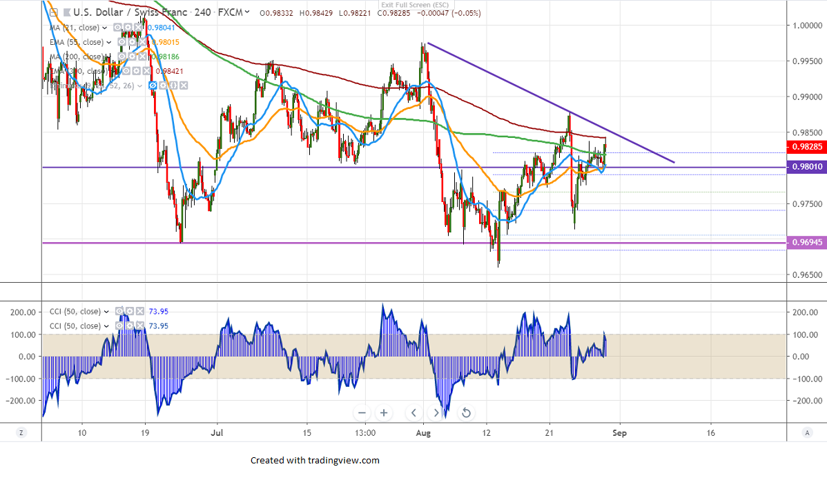 USDCHF is holding above 0.9800 as risk appetite shifts slightly to the global stock market. The sentiment got improved after the Chinese Commerce Ministry said that US-China trade talks are scheduled to happen by Sep. US futures gained more than 1% and markets eye US Prelim GDP data for further direction. US 10-year and 2-year yield curve got inverted by 5 bps which increases the chance of recession. It hits an intraday high of 0.98490 and is currently trading around 0.98283.