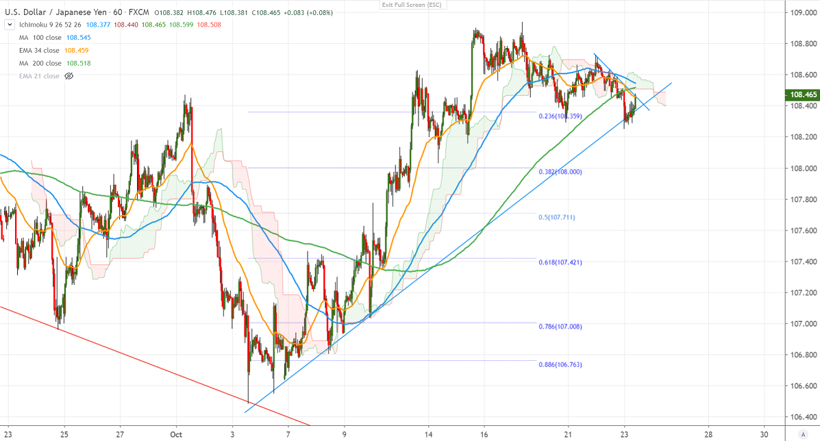 On the flip side, near term support is around 108 and any violation below will drag the pair till 107.70/107.37.