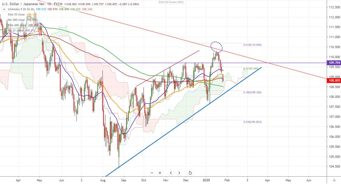 USDJPY is consolidating after hitting a low of 108.73 yesterday. The pair was trading lower after the outbreak of coronavirus. The total number died has increased to 106 and the number of infected cases jumped to 4515 from 2800 a day earlier. The gold and yen are benefiting from risk aversion. The pair hits a low of 108.72 and is currently trading around 108.84.