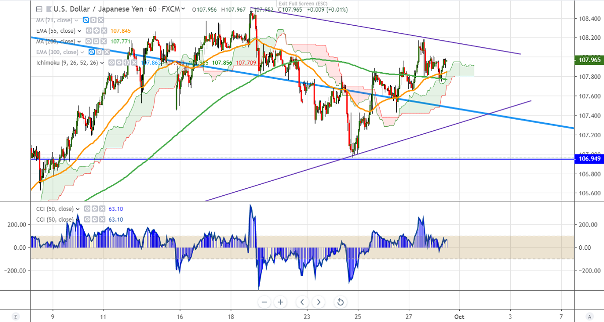 USDJPY has recovered slightly after a minor dip till 107.72. The slight easing of trade tension and broad-based USD dollar buying is supporting prices at lower levels. The pair hits high of 107.97 and is currently trading around 107.96.