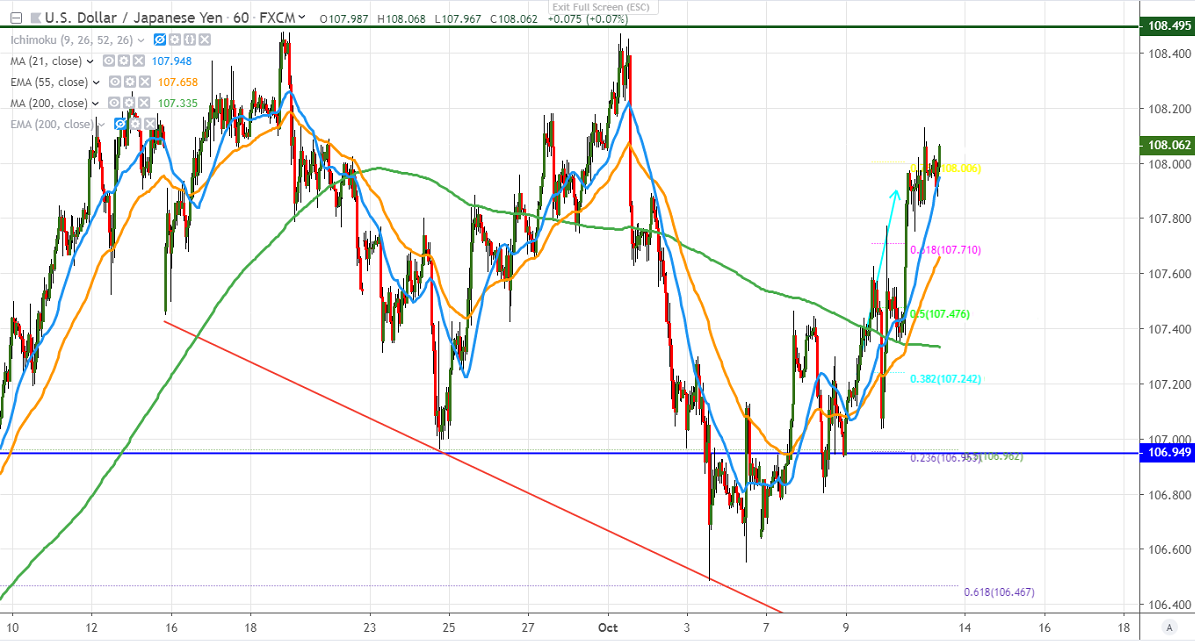 It is good to buy on dips around 107.90-108 with SL around 107.60 for the TP of 108.60.