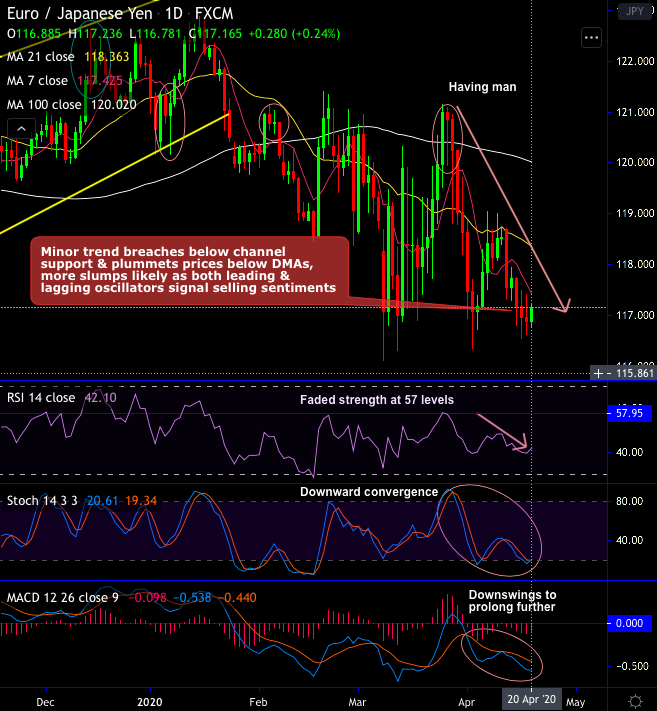 EURJPY’s price slumps have been constant ever since the formation of hanging man at 120.857 levels. The minor trend breaches below channel support & plummets prices below DMAs, more slumps likely as both leading & lagging oscillators signal selling sentiments (refer daily chart).