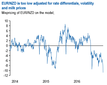 By our estimates, NZDUSD is nearly 7.5% (or 2.3 sigma) too high adjusted for milk prices, volatility and rate differentials, which is the third highest in three years.