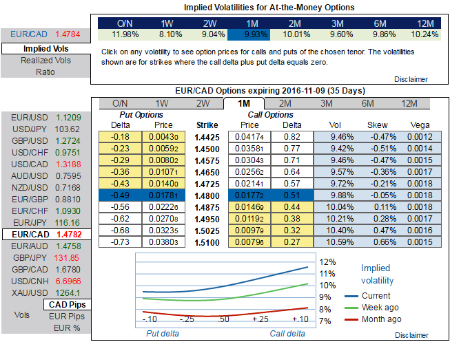 It is implied that the FX option price of EURCAD to move by 10%, for every 1% shift in the underlying spot.