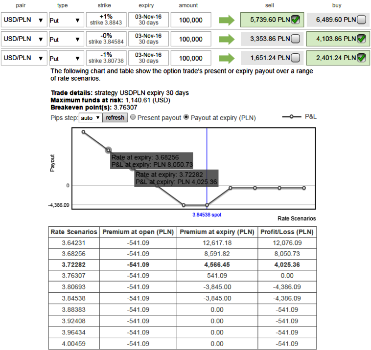 Maximum returns are limited to the extent of initial credit received if the USDPLN rallies above the upper breakeven point (BEP) but large unlimited profit can be achieved should the underlying exchange rate of USDPLN makes a vivid downswings below the lower BEP.
