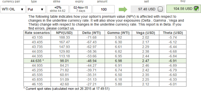 Let's suppose, as shown in the diagram, we have vega of at the money WTI put option at 2.47 with implied volatility at 20% which is now trading at US$104.38.