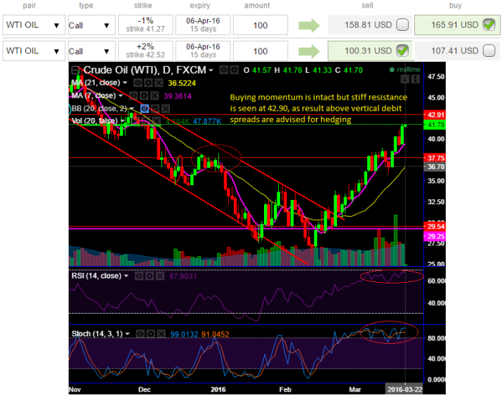 Buying momentum has been intensifying as it has broken crucial resistance at 37.75 levels on an intraday terms but when we consider the short-to- intermediate term trend of this commodity it shows a short term targets upto 42.22 levels and even upto 42.90 a barrel where a stiff resistance is seen.