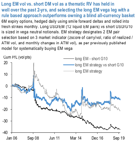 In the above chart, we adapt this same heuristic to systematically buying EM vega, but this time also alongside selling G10 vega.