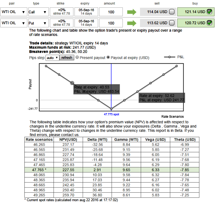 Since it should not damage the crude traders we like to remain in safe zone and hence, the recommendation would be buying an ATM straddle as shown in the diagram using at the money +0.51 delta calls and simultaneously at the money -0.49 delta puts of 2w expiries, thereby, one can benefit from certain returns or arrest uncertainties in the price risks even if the pair breaks out on either side in this span of 2 weeks.