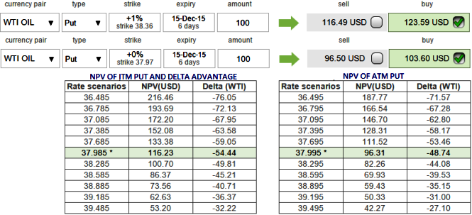This difference in delta is conducive to monitor downward directional risk which is intensifying amid crude supply glut, so you may know how much your option's value will increase or diminish as the underlying movement in crude oil market.