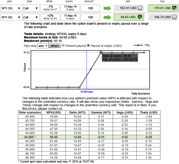 Vertical bull spread strategy is employed if you think that the price of the underlying WTI crude will rise reasonably in the near term but within a bracket of 2% upward range in 1 week.