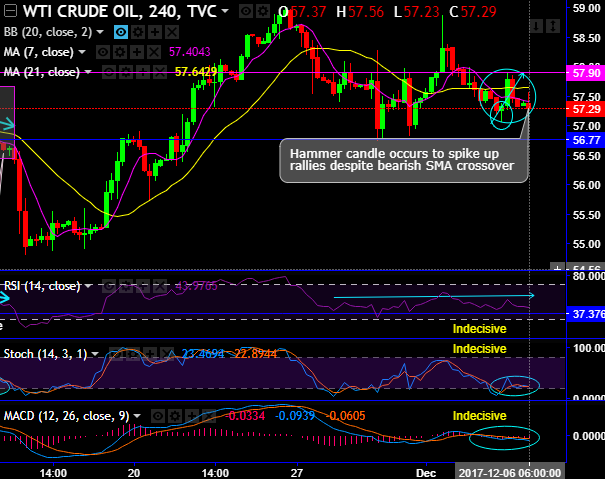 WTI crude prices have shown a fake jump above SMAs upto the stiff resistance of 57.90 levels and once again declined sharply from that level upon struggling bullish momentum.